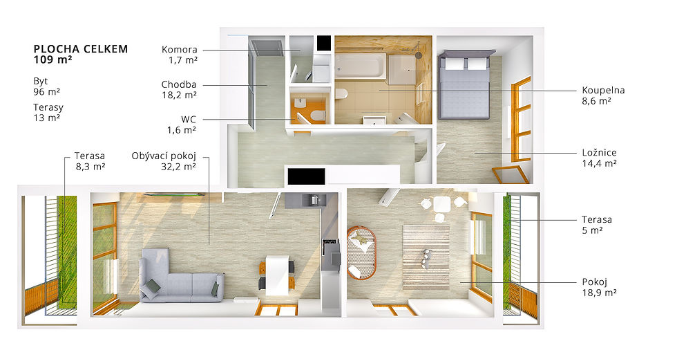 Z každé obytné místnosti v nabízeném bytě je vstup na jednu ze dvou teras, které spojují obytný prostor se sousedícími parky. Praktická dispozice, koupelna se sprchovým koutem i vanou po nákladné rekonstrukci, další WC oddělené, technická místnost pro pračku/sušičku, velkorysé úložné prostory v chodbě.